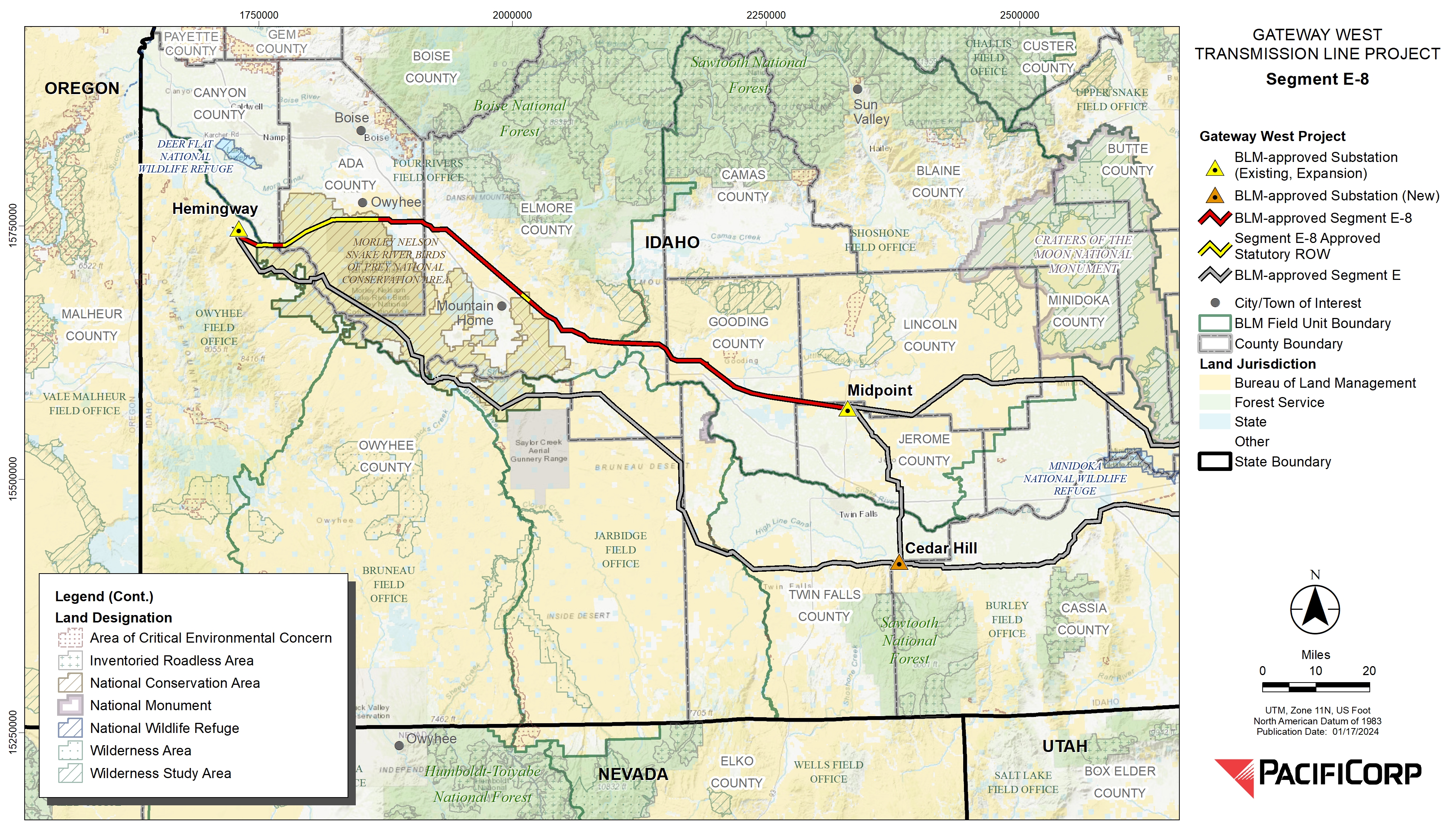Gateway West Segment E8 is a joint project with Idaho Power Company and is part of the Energy Gateway Program. This project is a key component to advance the goals of building resiliency, reliability and clean energy access in the Western energy grid. As part of the larger Energy Gateway Program, this project will consist of building a new 128-mile 500 kV transmission line between the existing Midpoint Substation in Jerome, Idaho, and the existing Hemingway Substation in Melba, Idaho. Expansions will be needed at both substations. Three signal regeneration stations will also be constructed along the line.
